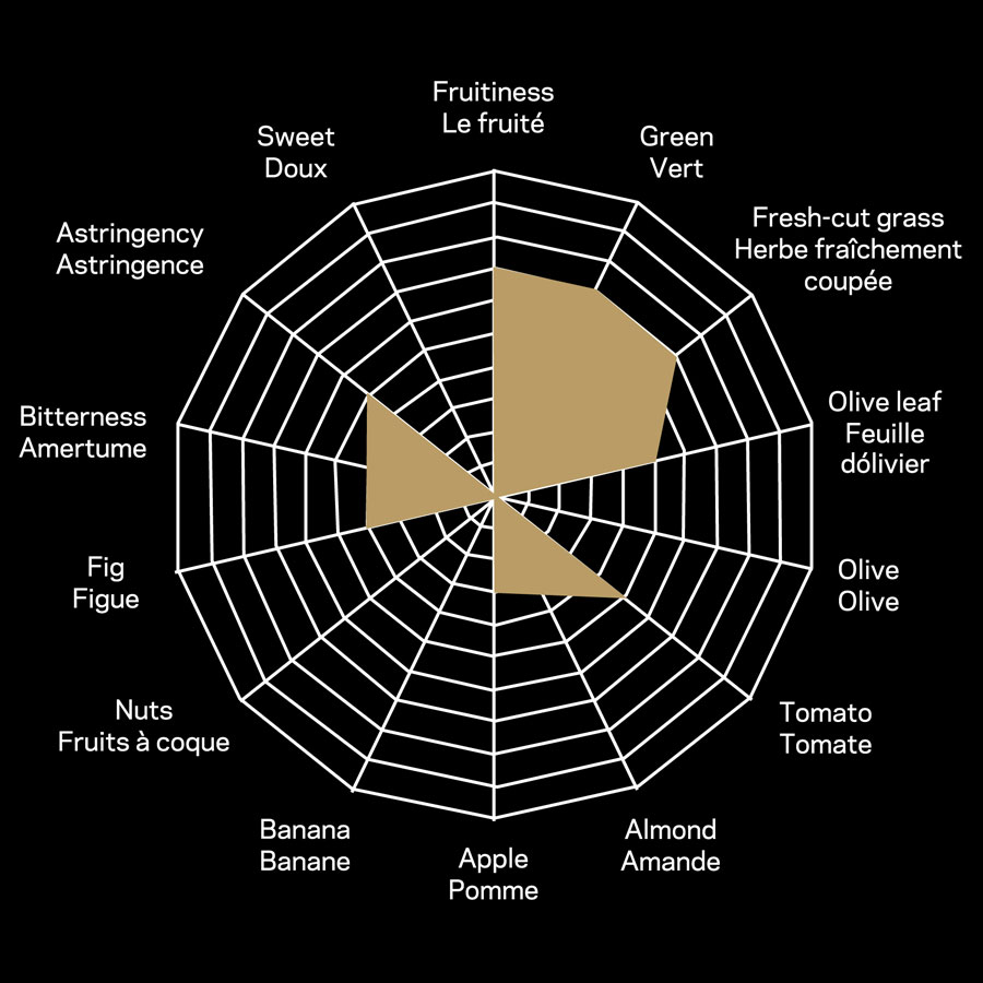 FUENOLIVA features the distinctive nuances of the Picual variety. The aroma suggests a fruity yet nutty flavour, with hints of wood, tomato, fresh-cut grass and figs. The bitterness, astringency and fragrant attributes complement each other, for which the Picual variety is well known for.